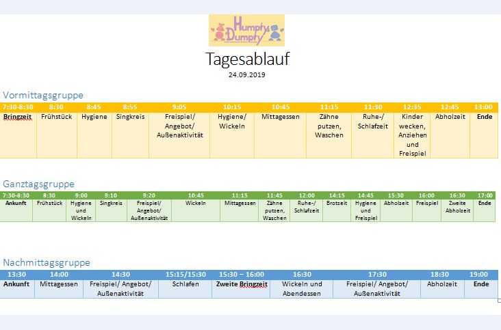 Die Gruppen: Es gibt eine Vormittags-, eine Nachmittags- und eine Ganztagsgruppe. Wir arbeiten Gruppenübergreifend.